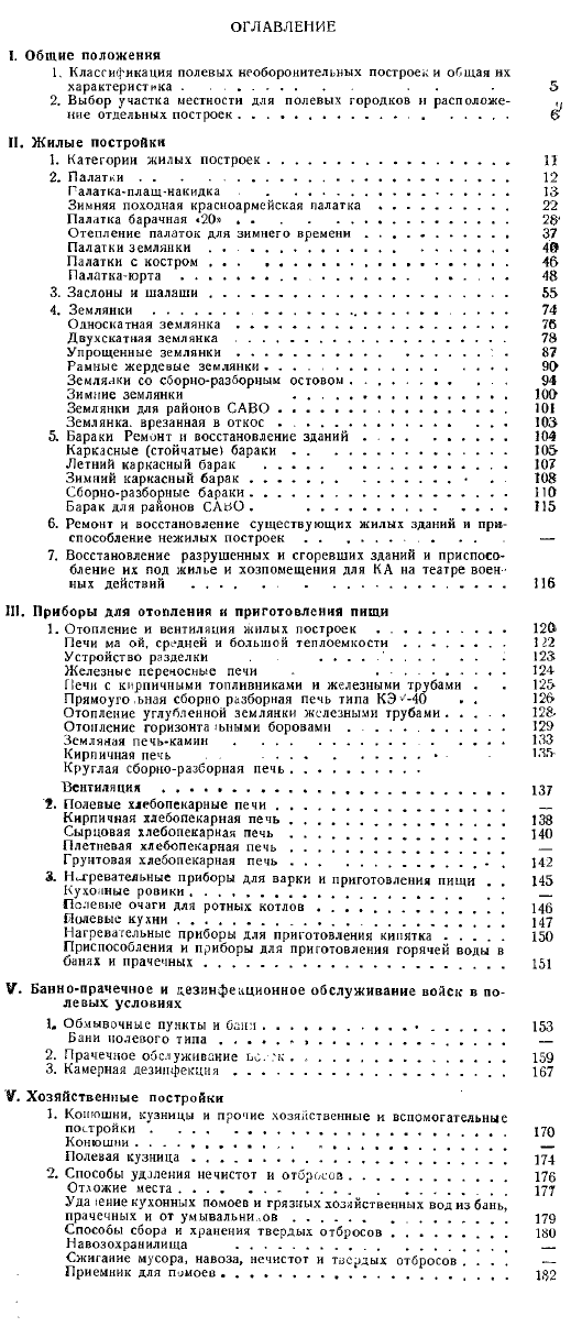 Книга посвящена полевым необоронительным постройкам - палаткам, землянкам, приборам для приготовления пищи в полевых условиях, банно-прачечному оборудованию, а так же хозяйственным постройкам и водоснабжению. Наставление разработано на основе труда инж. Н. В. Мединского по полевым необоронительным постройкам 1929 г. издания и полевым исследованиям ВИА РККА.