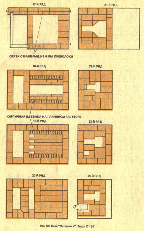 Печь оборудована вентиляционной задвижкой и водогрейной коробкой. Учитывая, что изготовить водогрейную коробку самому не всегда возможно, чертеж варианта печи с водогрейной, коробкой дается отдельно (см. рис. 62). Для лучшего представления об устройстве нижней части печи в дополнение к планам даются рельефные изображения первых 12 рядов (рис. 63, 64).