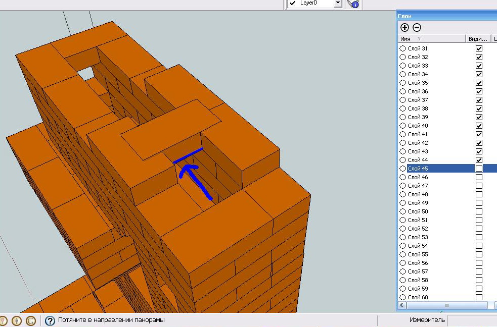 2.Ряд 46 и 47. Там кирпич в середине (обозначил красным) не перекрывает шов предыдущего.Т.е. в 46 ряду на этот кирпич, такой -же ложится кирпич в 47 ряду. Так должно быть? Или это ошибка?