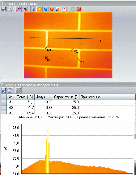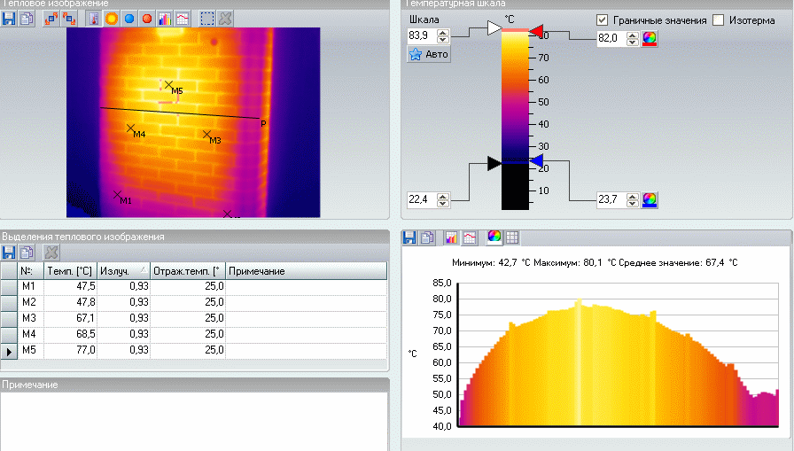По таблице коэф. излучения на кирпич, строительный раствор и штукатурка соответсвуют 0,93, керамика 0,92. Но даже если изменить в пределах от 0.9-0.94 все одно, разница почти в 10 гр.С