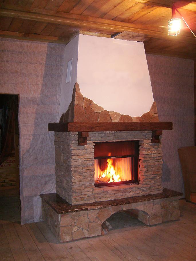 Кирпичный камин, облицовка известняк с Жигулевских гор, с верху деревянная балка, дымосборник обшит ГКЛ.
