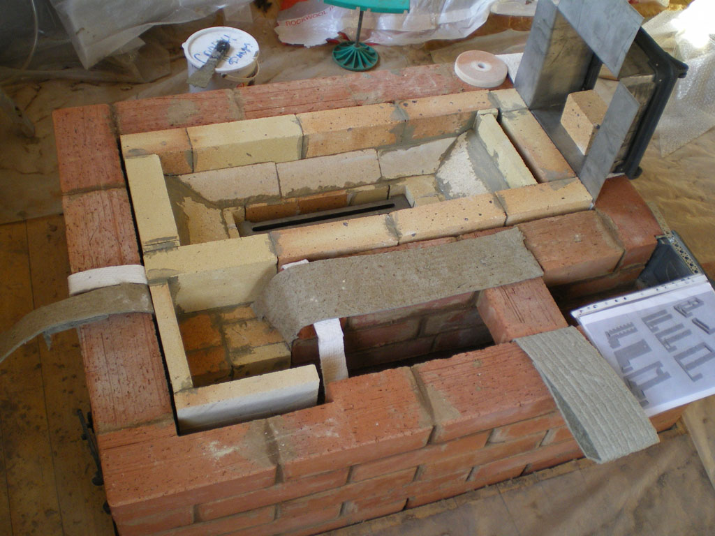Здесь поднимается футеровка угла. Со смещением. Нижняя лещадка (опорная) заходит в красную стенку. Это чтобы прочистке не мешать. Постепенно смещается в колпак. Щель получилась вверху немного великовата, но она уже сведена на нет.