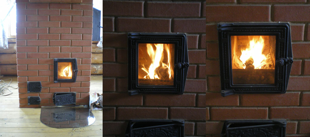 Интресно было глядеть как то из задвижки пойдет дым, то из прочистной дверки... Потом перестает. Немножко то надо в дом... Еще печь не высушена до конца. Будем потихоньку протапливать. Было положено всего 4 полена не толстых, зажжено спереди, но быстро зажглись поленья по всей длине. Вода в кастрюльке смогла градусов до 50 нагреться. Почти вся ХК была теплой. Последний кадр - осталось последнее несгоревшее полено - были скинуты угли на колосник, а полено на эти угли. Как весело оно занялось и поддувальной дверкой можно было регулировать высоту пламени. Кстати пламя достает нормально до чугунного настила, даже когда всего 4 полена. При открытии дверки не происходит отклонения огня к дверке - далеко топка находится от нее.
