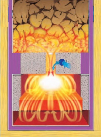 | Она может сравниваться с ОВИК на плите которой вместо казана с борщом стоит колба горлышком вниз с дровами, дым от которых попадает обратно в нижнюю топку и там догорает. |