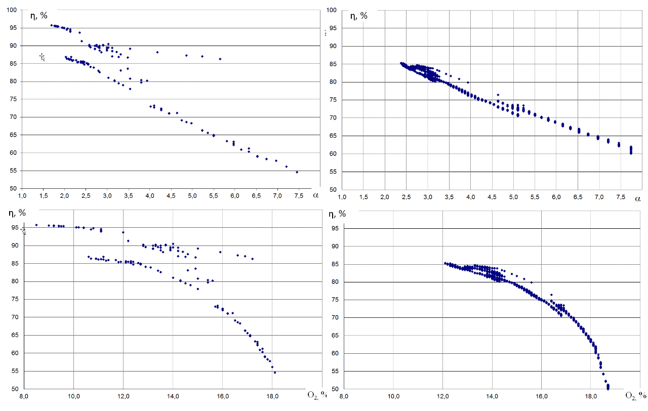 В продолжение испытаний хочу предоставить данные по замерам состава ДГ и зависимостей КПД (расчет по прибору Тесто) от альфа, О2.