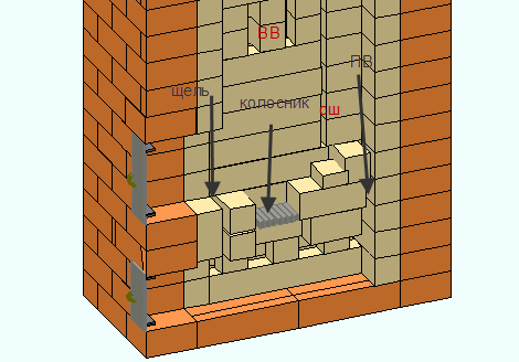 Пространство от задней стенки до боковых стенок топливника с каналами ВВ было заделано шамотными балками с подгонкой СШ 1 см с каждой стороны.