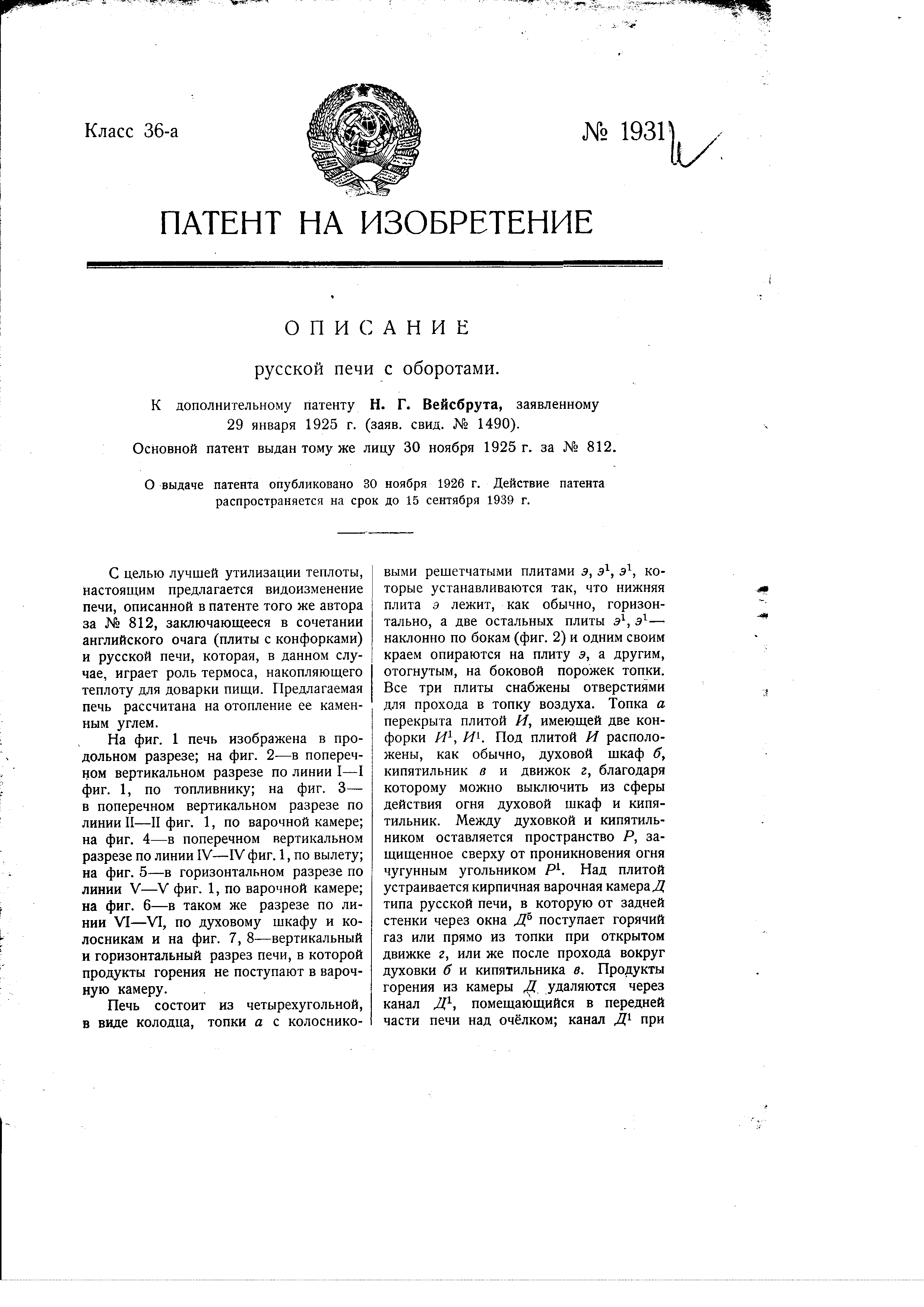 | Изобретение С.Борисова относится к обустройству русской печи и над хайлом выкладывается горизонтальный порог, который отбивает газы к внутренней части камеры. |