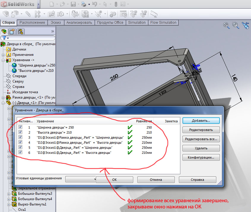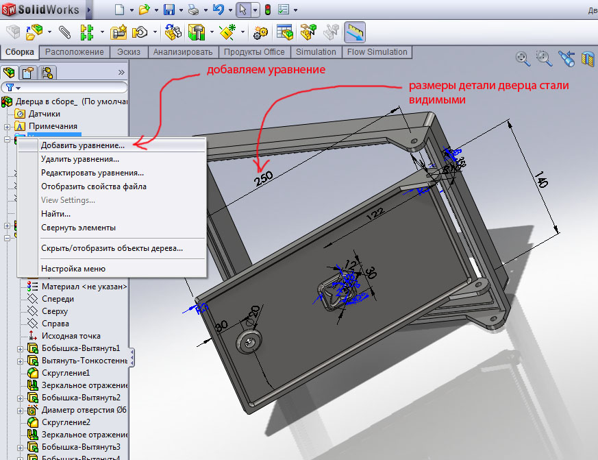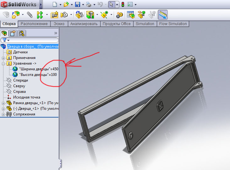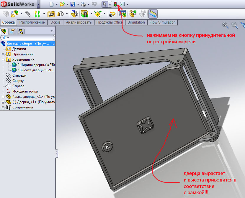 Подведем итоги. Мы создали иерархическую структуру во главе которой стоит сборка, ей подчинены две детали, которые сначала вели себя независимо. Сборка дает деталям общие приказы, соблюдать ширину и высоту конструкции, в то же время деталям на откуп даются мелочи конструкции (бортики, петли, отверстия, приливы и т.п.), этими мелочами детали не обременяют сборку.