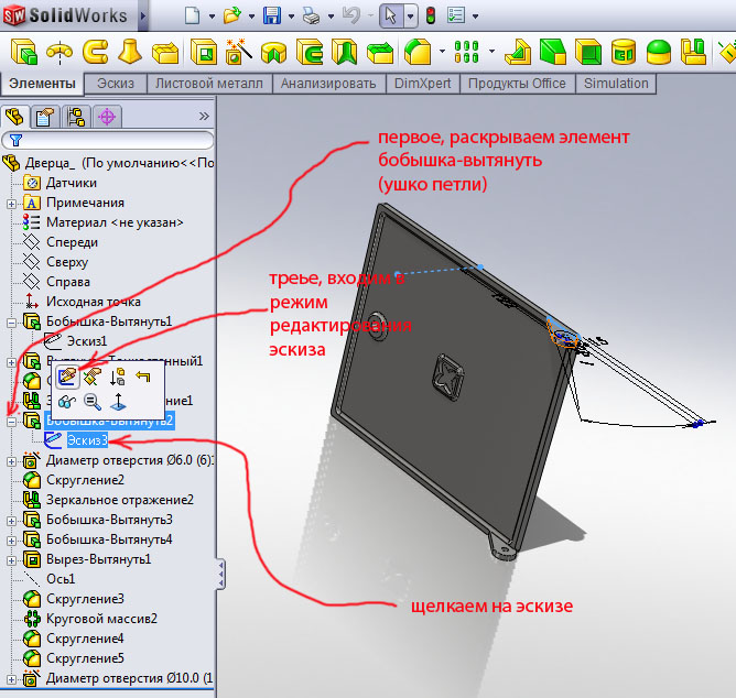 Щелкаем на дверце и в окошке нажимаем открыть деталь рис.42.