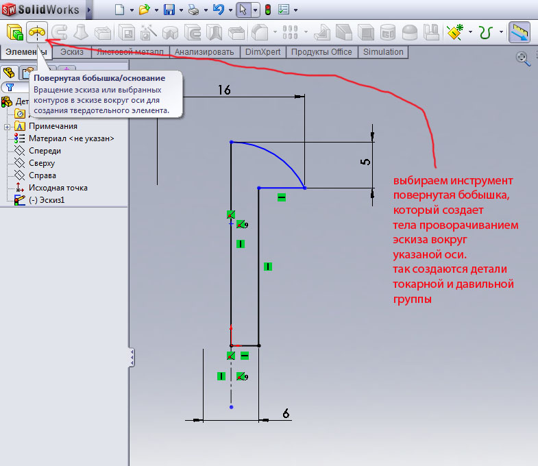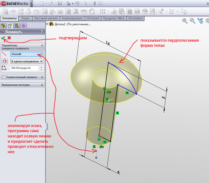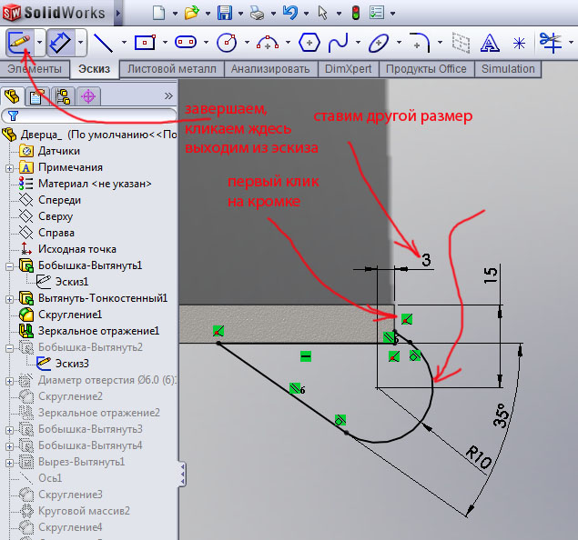 Сначала кликаем на пустом поле плоскости симметрии рис.65. Потом жмем в дереве на плоскость сверху детали заклепка. Далее кликаем на пустом поле объектов симметрии.