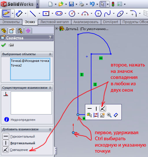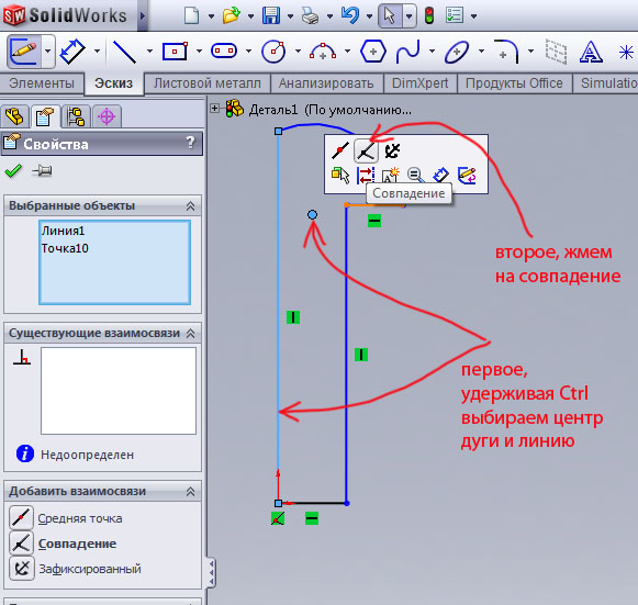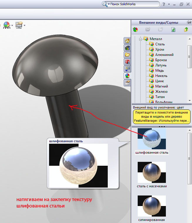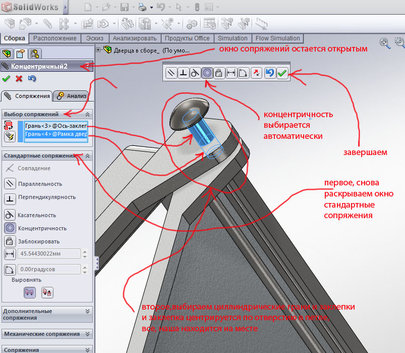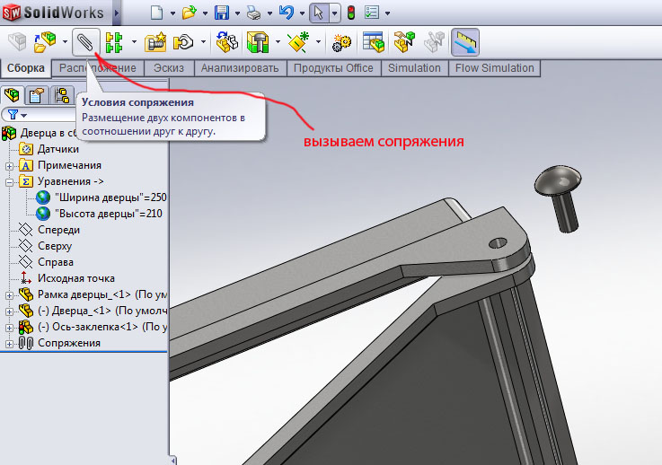 Теперь закрываем окно заклепки, а окно сборки разворачиваем на весь экран. Привяжем заклепку в нужное место, вызываем сопряжения.