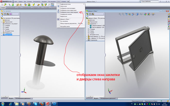 Далее лезем вверх в меню и располагаем открытые окна слева направо. Теперь слева заклепка, а справа сборка рис.61.