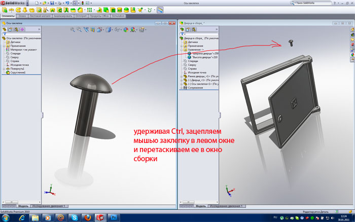 Делаем следующий трюк. Удерживая Ctrl зацепляем мышью заклепку и перетаскиваем ее, из окна в окно, в сборку рис.62.