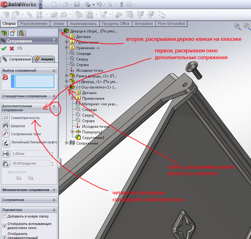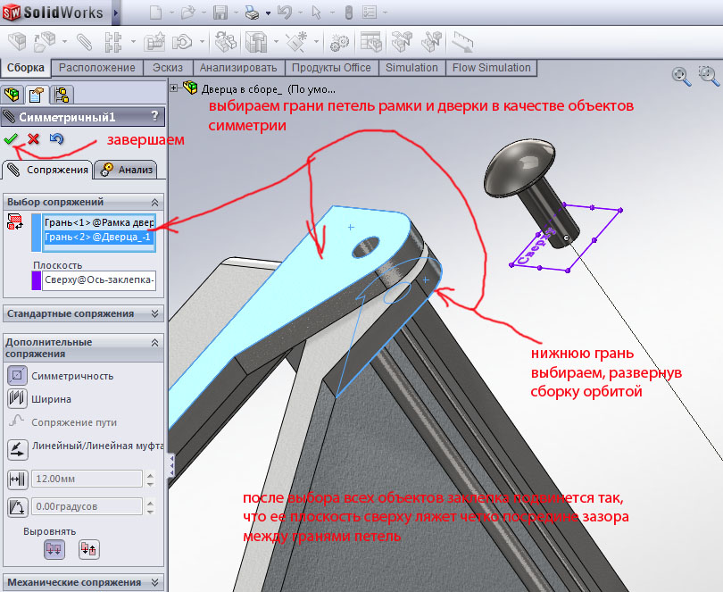 Раскроем окно дополнительных сопряжений и выберем симметричность. Это сопряжение применяют когда одну плоскость или грань нужно точно расположить между двумя другими.