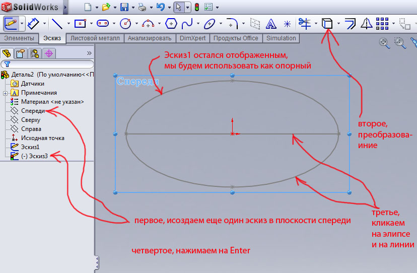 Отсекаем нижнюю часть элипса руководствуясь рис.78 и выходим из эскиза3, после чего скрываем его рис.79.