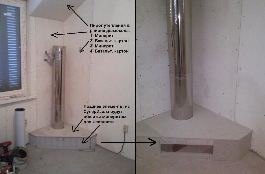 Деревянная балка находящаяса в 7 см от дымохода. Она была обработанна 3-мя слоями огнезащитного раствора Пирилакс+обернута базальтовым картоном + обшита Суперизолом. С электро проводкой решили так ...2-ва слоя Суперизола.