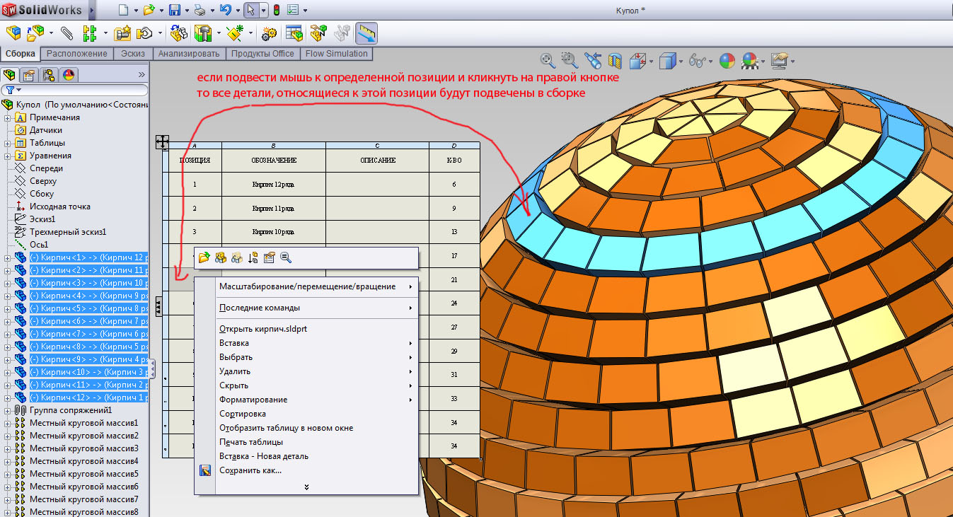 Если мы наведем мышь на строку детали в таблице спецификаций и нажмем правую кнопку, то она подсветится в сборке, вернее подсветятся все такие детали. Это очень удобно для поиска и отображения деталей и узлов в сборках рис.4.