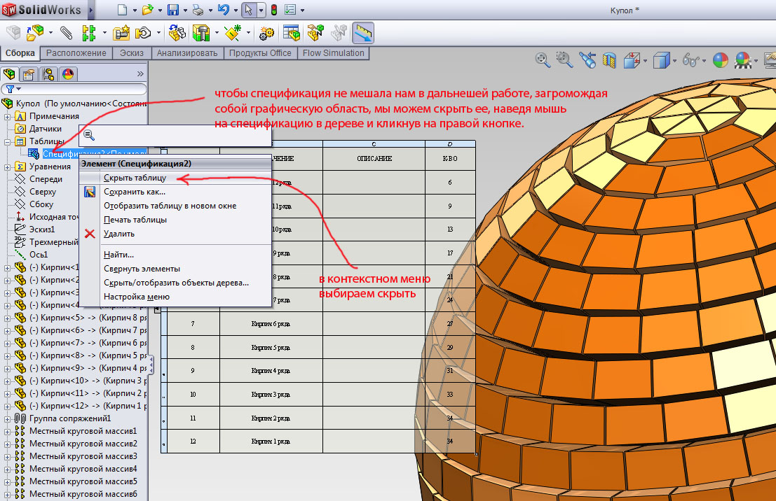 Чтобы таблица не мешала нам работать, закрывая собой сборку, то мы можем скрыть ее рис.6. Отображается она тем же путем. Или мы можем вообще удалить таблицу, а потом сгенерировать ее снова.