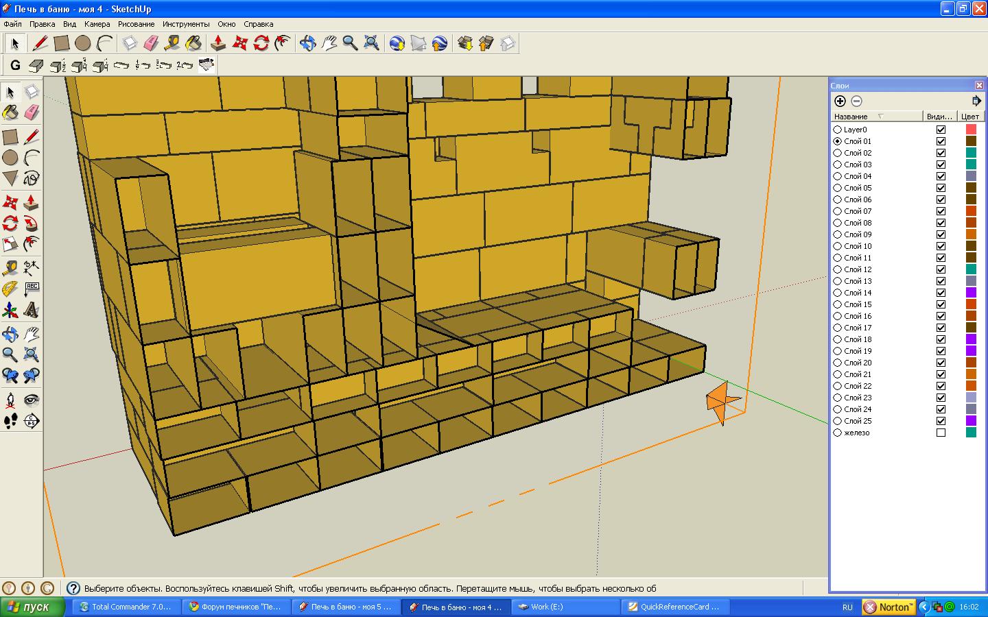 Спасибо всем большое что не бросили в «беде»! Всё пошло просто отлично! Я пока решила остановиться на инструментах из меню. Для начала хватит. Хочу поделиться маленькой победой. Понадобился мне закруглённый кирпич(муж его поворотником называет). Ну, прямоугольник, дуга, тяну, но остались две полоски на закруглённой грани в местах прикрепления дуги. Рисую простой кирпич, дугу, выдавливаю-та же пакость. Билась всяко разно, все способы попробовала, которые В.Солин Дымку советовал, но линия стирается вместе со смежной гранью, хоть тресни. Потом добрый дух Скетчапа сжалился надо мной и…Далее механизм: выделяем проблемный объект и на правом щелчке выбираем ‘сгладить/смягчить края’ и полоски исчезают. Там ещё окошко выпадает с настройкой. У меня на 25 установлено было. Я попробовала более сложную конструкцию со многими «лишними» полосками-работает. Как-нибудь прокомментируете сие «достижение»? Или я открыла лисапед?