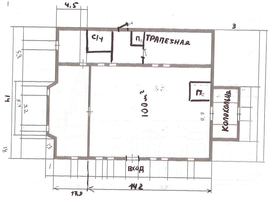 А стена между трапезной и молитвенным залом капитальная? какой материал? какова толщина её? В этой стене ведь возможно встроить печь отопительно-варочную как большой щиток + с воздухогрейными-калориферными каналами. А для увеличения теплоёмкости печи - ещё и с прогревваемой лежанкой-топчаном вдоль стенки в молитвенной зале.