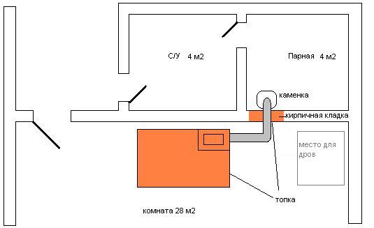 такой вариант неприемлем, во первых фундамент под печь уже залит, а во вторых при таком расположении печь будет не посередине комнаты и придвинута дверцами к другой стене. Да и проход трубы от каменки сквозь стену будет закрыт, следить за состоянием неудобно будет.