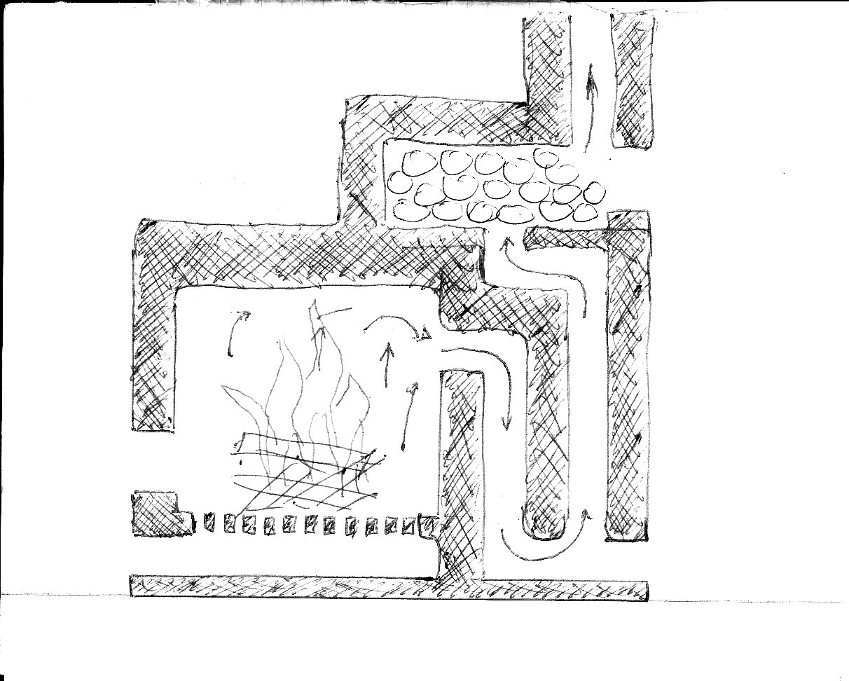 В вашем варианте обеспечена сажа на камнях и тяжелый пуск печи, даже если и работать будет (уменьшив сопротивление засыпки каналами прямого хода)