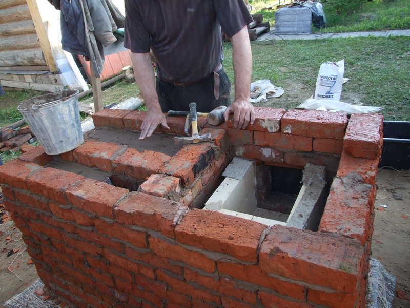 Первый ряд выкладываем ровный прямоугольник с проверкой геометрии "по углам", второй - бутуем, третий - формируем объем печи. Установка прочистной дверцы обязательно, на случай запуска печи летом. |