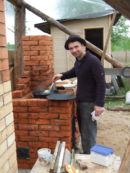 Дымила не плита, а шел черный дым из трубы (десять рядов в 70 см), когда печь загоняли в такой режим топки. Могло быть две причины: мал колосник подачи воздуха в топку или мала тяга от трубы (сверху и сзади трубы висела пленка ПВХ от дождя, буквально в метре от трубы). В любом случае -нехватка воздуха для горения. При полной закладке топлива из трубы шел черный дым, поэтому приходилось приоткрывать топочную дверцу. Это было на начальном этапе разогрева топливника, хотя этим приемом и пользовались при готовке пищи и регулировке степени нагрева казана. СШ в топке не сделан. А зря. В дальнейшем на печах такого типа уже делался. В любом случае все время семинара печь работала и не только кормила нас, но согревала вечерами.