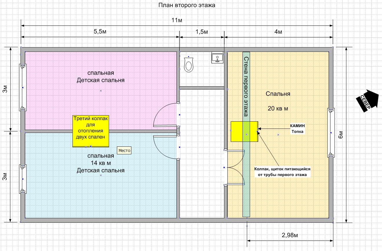 | Рассмотри вариант топки печи на 1м этаже из коридора.Перед печи коридор будет греть.Золу и угли на самовар в коридор желательно.Ищи жестянщика и заказывай самоварник-это круглый патрубок для подключения самовара.Так и просится капитальная стена на 38 см для расположения в ней дымохода на несколько каналов.Сан узел прижми к капиталке и один вент канал уже в работе.Под камин залей пятно в составе стены.Дед МОРОЗ УЖЕ ПОДАРКИ СОБИРАЕТ на Севере.Проект требует пересмотра с опытным проектировщиком.Помни что лестница нв 2й этаж тепло тянет на верх.Дверь на2й этаж ставь.Перегородки из кирпича делай.Солнечная Башкирия.... |