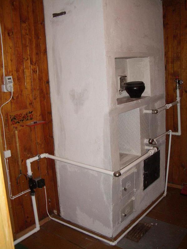 У Ваших знакомых, к уже имеющейся печи приспособлен котёл, в виде бака, что может и достаточно бюджетно, но не достаточно эффективно.