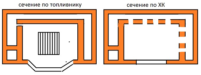 | В левом переднем углу переточной канал, остальная часть левой стороны единое целое с пространством за топкой и справа и объединены с топкой через сухой шов. |