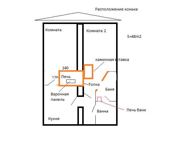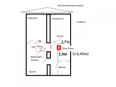 | Если не затевать ничего, можно решить проблему неравномерного прогрева комнат, выдвинув печь в сторону 2 комнаты. Если что-то затевать, то только не ванну. Во-первых проблемы с водой, в бане её необходимо намного меньше, подойдёт и снег, во-вторых лишние сложности с нагревом воды, а главное парится намного полезнее и приятнее, чем просто мыться. |