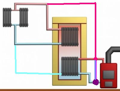 2) котел + бак накопитель + батареи (Тут бак играет роль буфера ...выравнивает "плюсовую" температуру из котла и "минусовую" из батарей. Плюс добавляет инертности в систему. Огонь потух а батареи горячие)