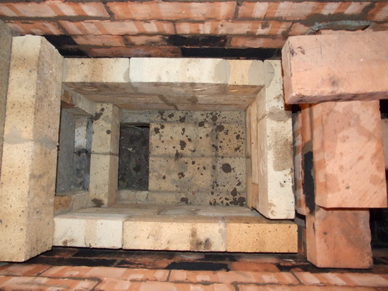 в процессе тестов был убран под на 1/2 кирпича и уложен колосник вдоль, но для опоры спереди колосника уложенная балочка оказалась чуть выше, так и получилось, что колосник РД5 (300х250) оказался под углом