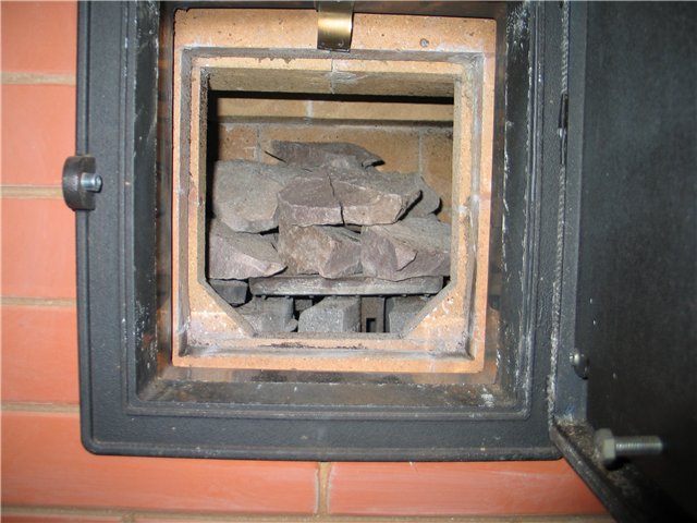 Закладка в каменке лежит на поду без щелей в топку. Основной прогрев идет ИК излучением от пламени и дополнительно конвективно через разрыв в стенке горелки (слева внизу под верхней вставкой). Верхняя часть горелки (вставка) м.б выполнена из шамотной плиты (кирпич), а лучше легковеса или теплоизолятора (суперизол), а так же, например, из талькохлоритовой плиты (у меня сейчас).