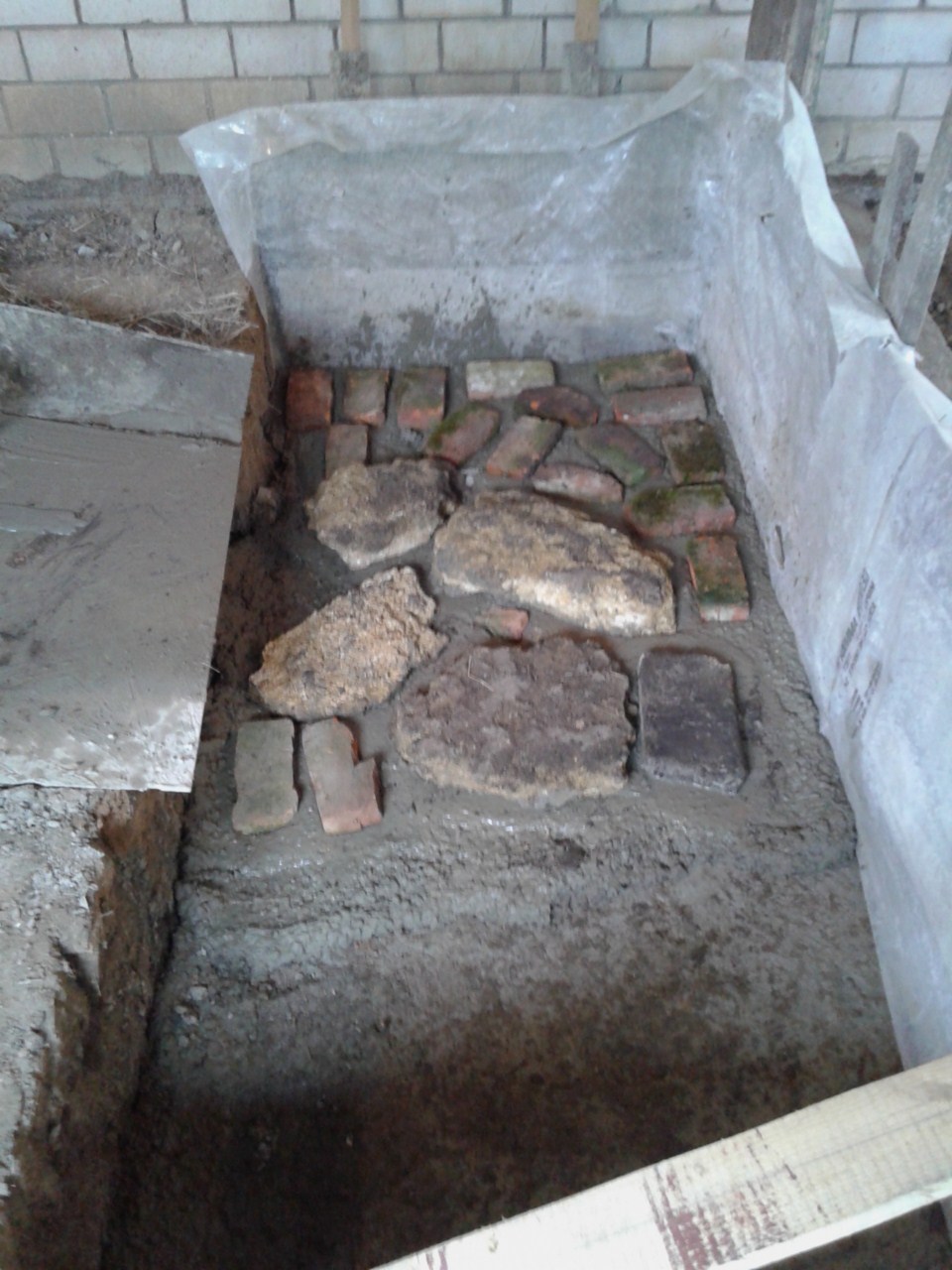 | Приготовились заливать, внизу на кирпичах под которыми слой песка, лежит арматурная сетка. |