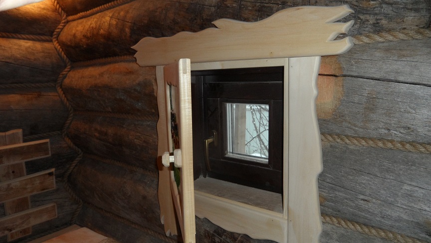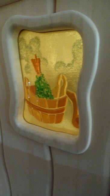 С лева при входе сидячий полок 500 мм(с подспинником) , спереди (напротив входа) рабочий полок 800мм расположен ,а выше него декор элемент окошко(бутафория). Помещение 2,5х2,5 м как показывает практика мало для того что бы разгуляться в отделке даже с вагонкой, не говорю уже о "стиле лешего". Ведь отделка бани не обрезной доской требует большей площади в парной. Вот и приходится входить в положение ... и кроить