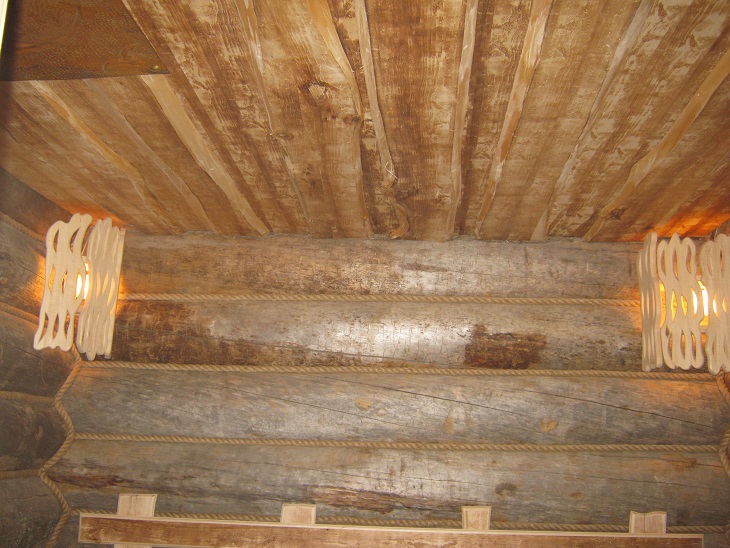 При отделки бани приминини не боьшое новшество. В углах, по периметру всей бани, в качестве завершающего элемента, пустили брус липа сечение 70х70, вместо пеньковой-льняной веревки.