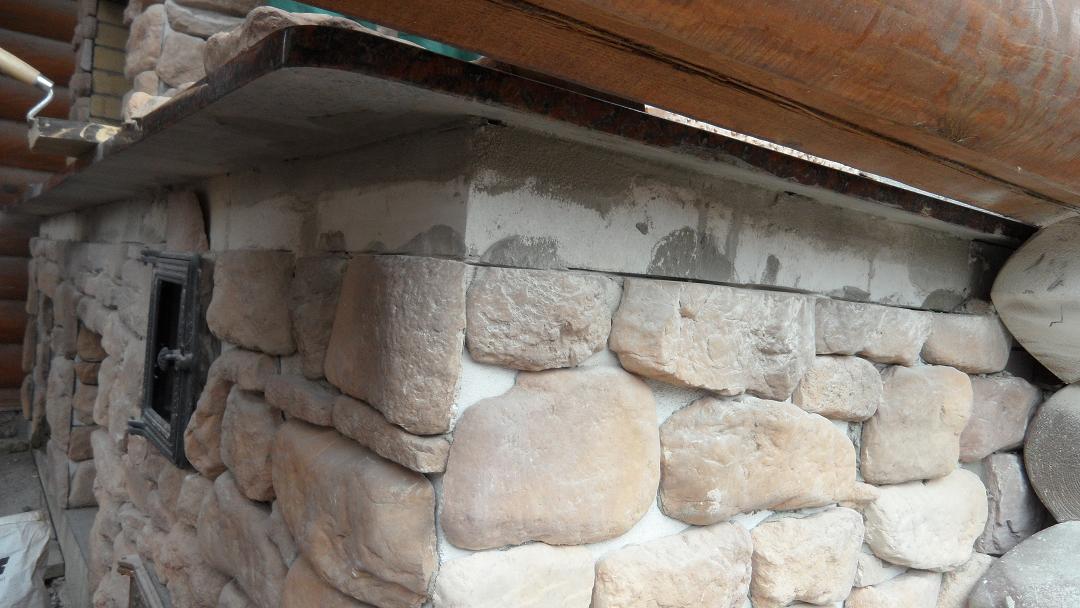 Кирпичную топку мы снаружи обкладываем. И уже дальше на пенобетон клеим