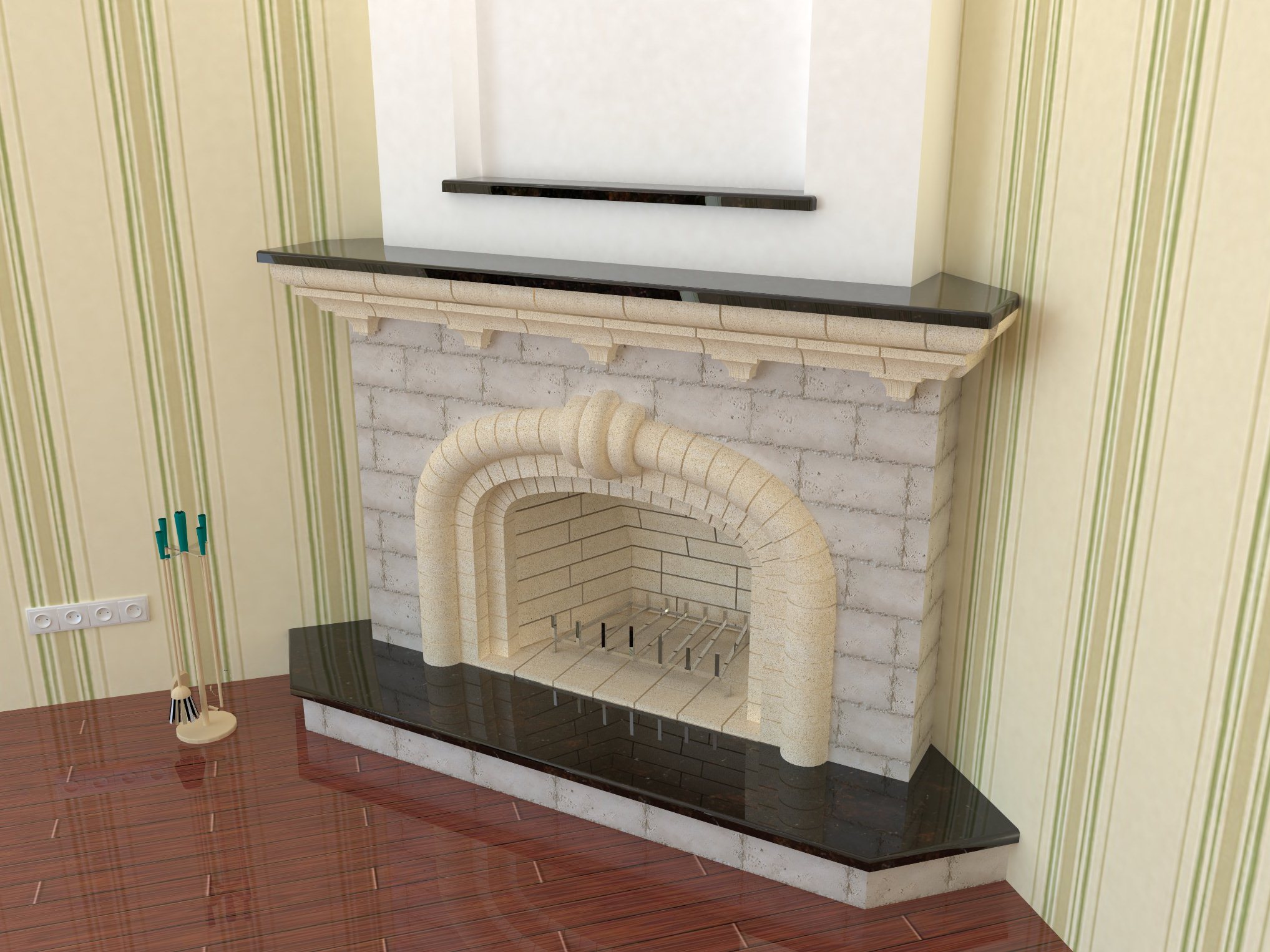 Владимир, это всё тот же Vray. В принципе там можно абсолютно любой материал получить, хоть полированый, хоть зеркальный, хоть прозрачный, (для стекол топки), хоть светящийся (на картинке это экран телевизора и светильники).
