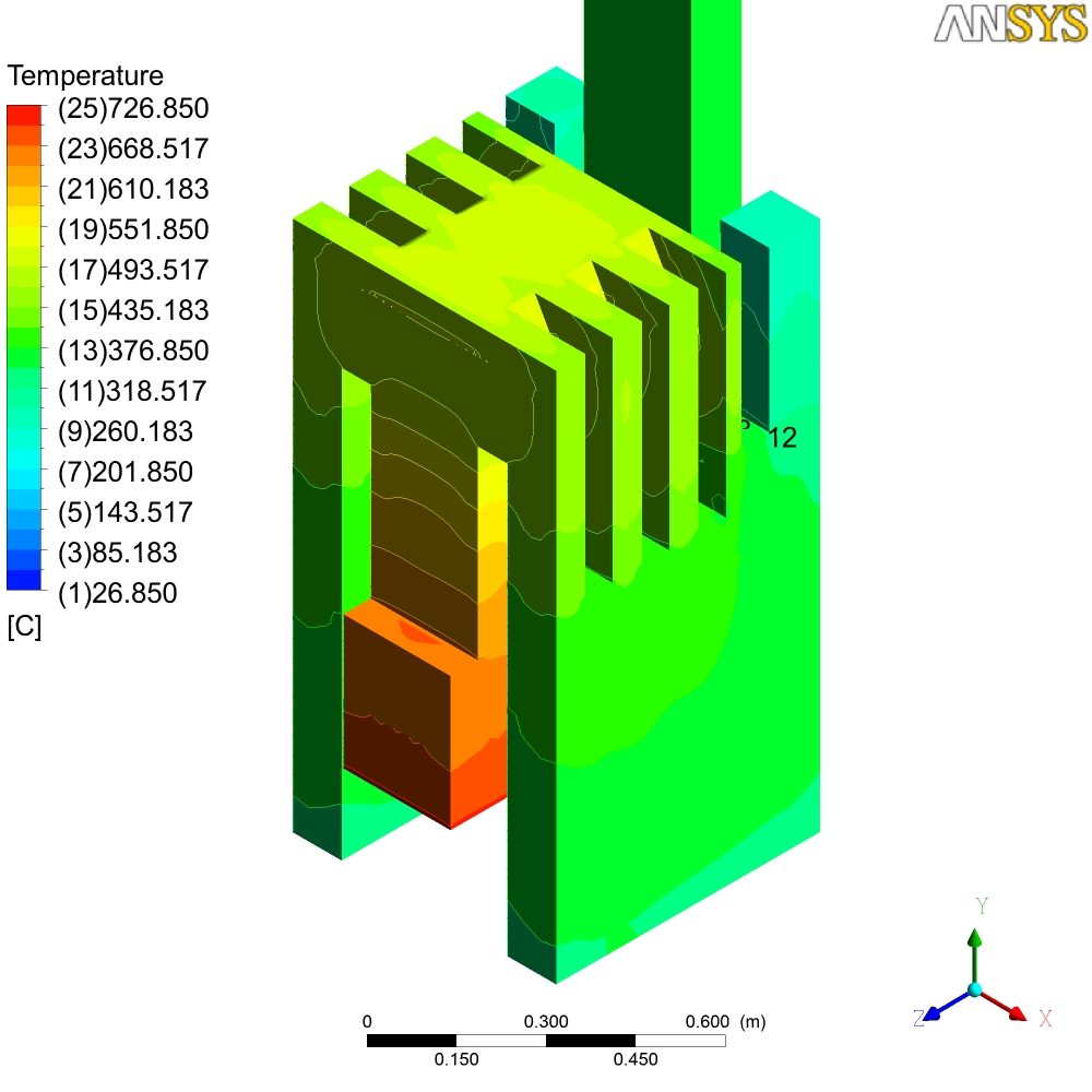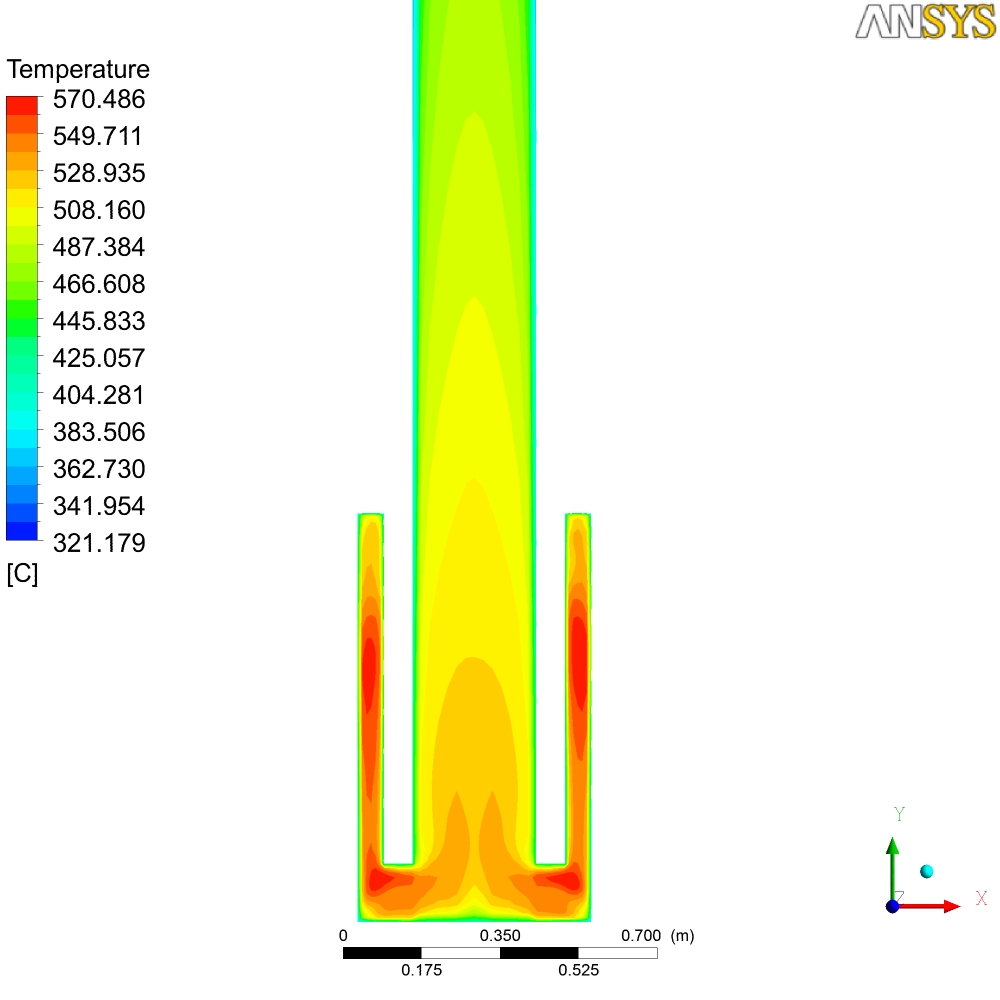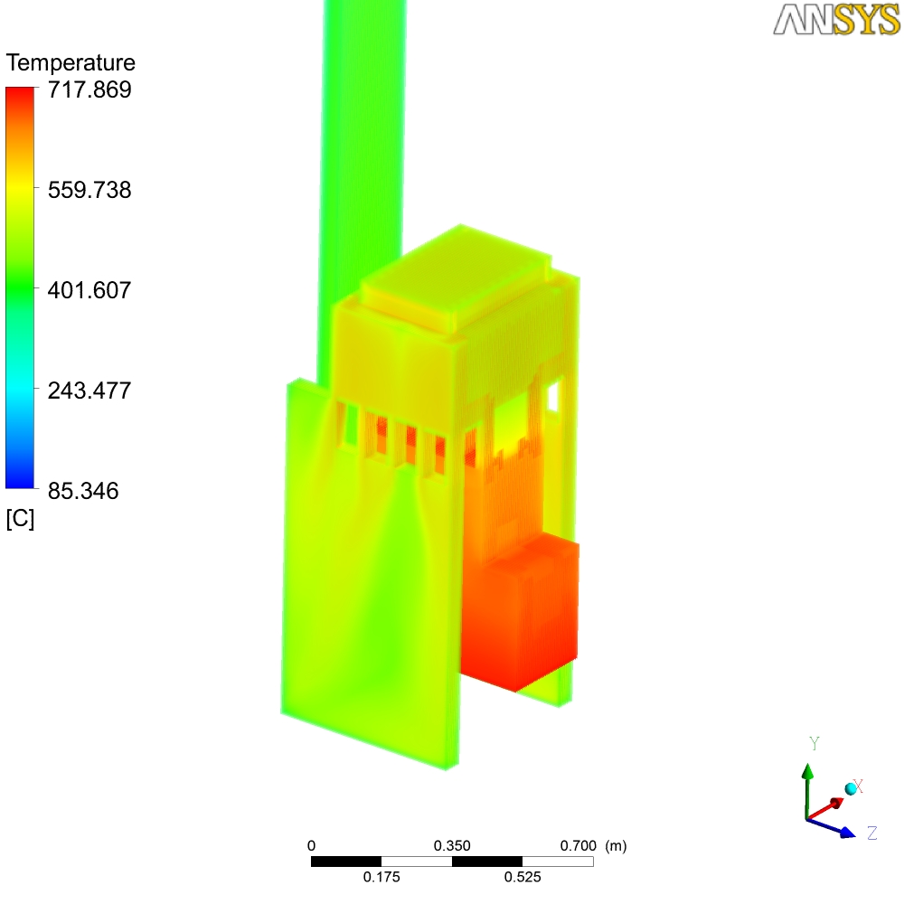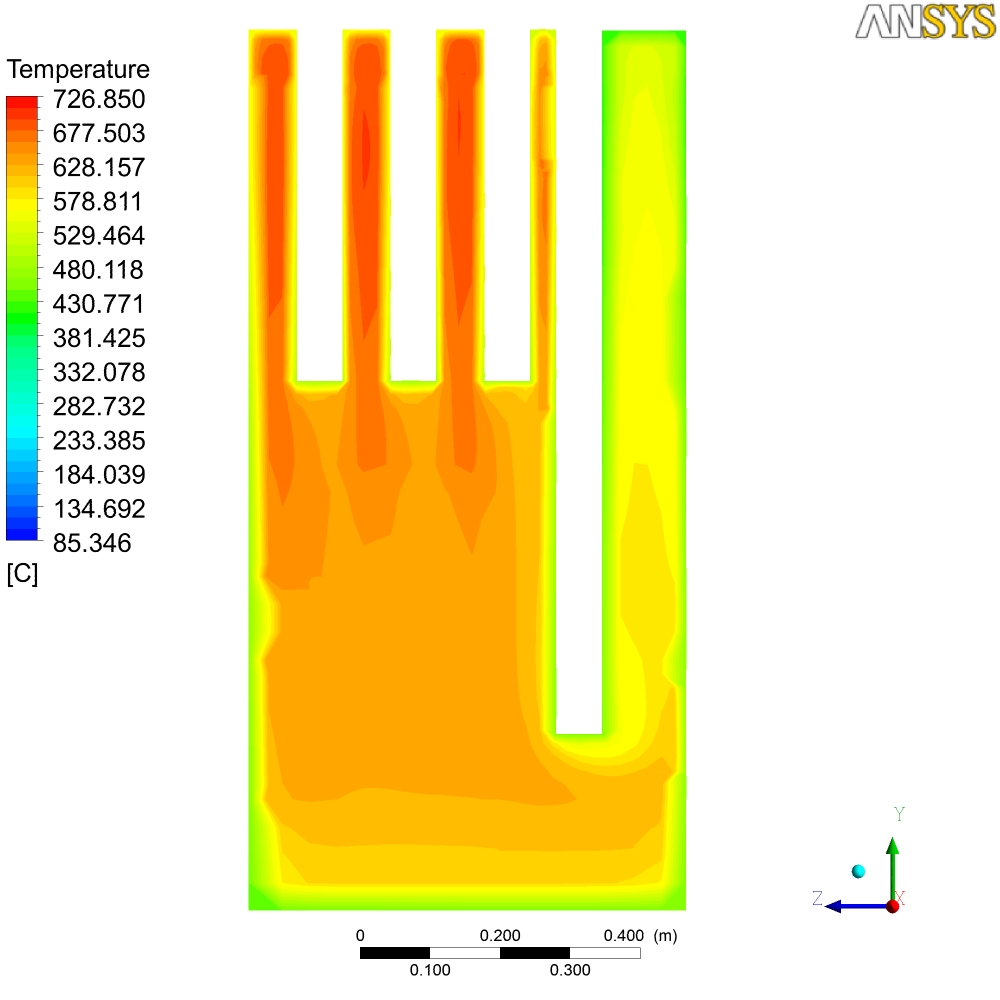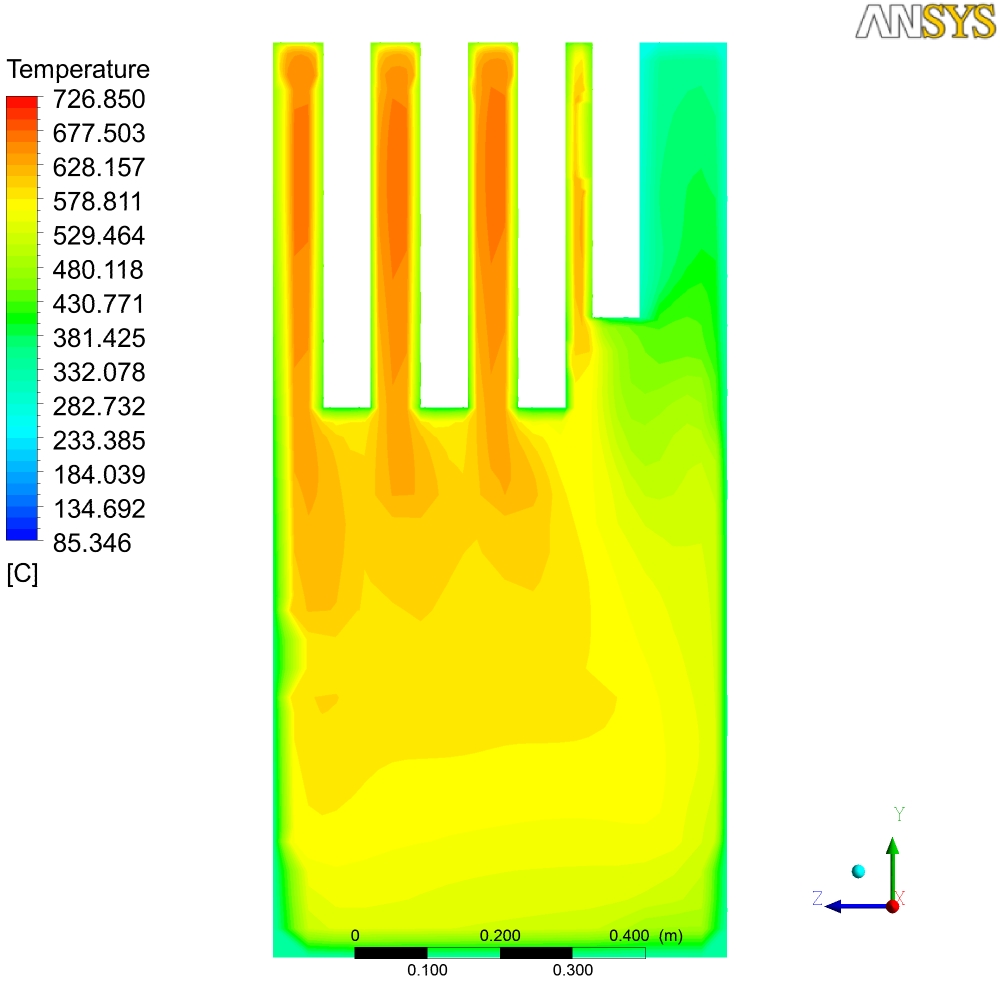 В общем-то там на картинках печь просчитанная в Ansys, начальные условия - 700С. Тяга от трубы... Могу сделать любой разрез по температурам, давлению, скоростям и т.д. Единственное, что не учитывется теплопроводность стенок - они адиабатны - т.е. то что мы видем - не температура стенок печи, а температура пламени и газов...