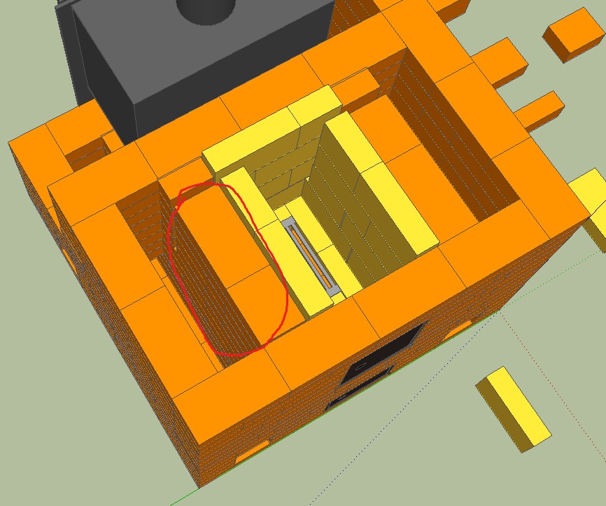 На первом рисунке отрисовал топку, сухой шов сделал 2 см, далее последний ряд топки и перекрытие двумя рядами(в первом ряду перекрытия по центру дырка). В последнем ряду топки расстояние между кирпичами 5 см. Базальтовый утеплитель рисовать не стал. Сгодится если так сделаю? Еще вопросик по камину возник, т.к. я расширил печь, то решил увеличить еще и глубину, какую высоту портала тогда необходимо сделать?