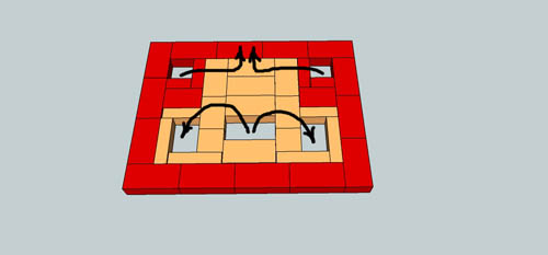 А если подъёмные каналы пройтись красным кирпичом на ребро, тупо на раствор к наружному контуру? Лещадку придётся в каждом ряду вязать с основным ядром, что гемор, а простой шамот можно и пореже. Хотя начинать надо с лещадки и испытывать на нагрев. «Красные уголки» хочется сохранить, а не делать всё из шамота, для того чтобы после задвижки прямого хода, над топкой, закончить с шамотным ядром и перекрыться с зазором через вату красным кирпичом. Тогда трубу можно будет ставить не на шамот, а использовать и наружный контур, что более технологично, имхо. Этим хочу решить проблему недогретого "зада". Шамот будет "сопровождать" дым только по среднему подъёмному каналу «по лицу» и в опускных каналах. Понятно, что «изобретаю велосипед», но хочется самому прийти к нужной конструкции, а не использовать чужие проекты