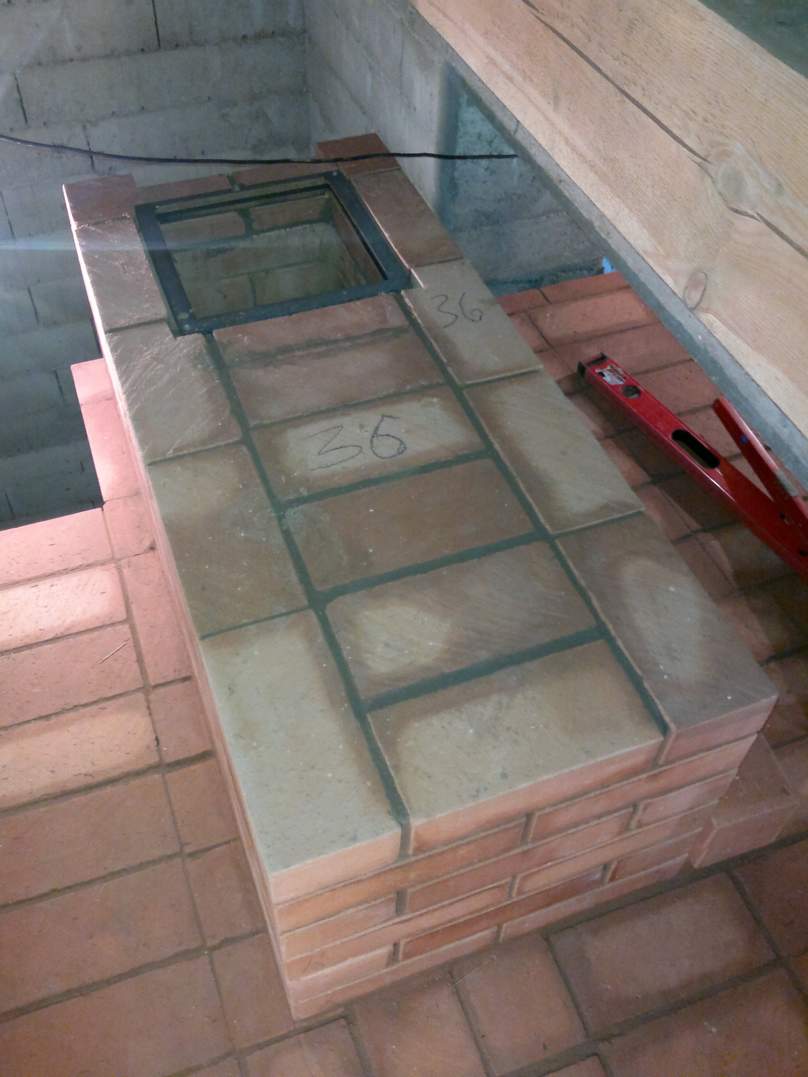По тех.решению И.В.Кузнецова получилась печь с задним камином, размер 7,5 (со стороны топки) на 7 кирпичей. Фундамент под печь изначально был сделан меньших размеров, и позже, когда его доливал, сделал с небольшим запасом. В итоге пришло решение удлинить печь на кирпич, стала 7,5х8.