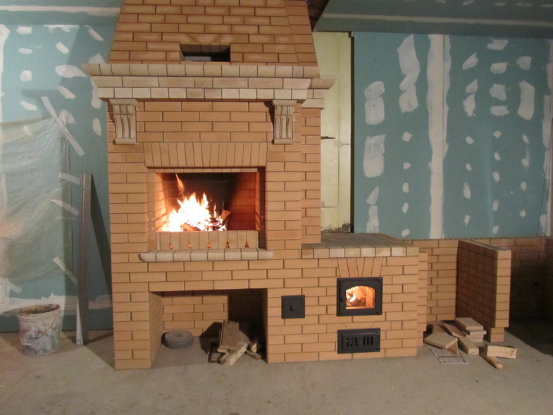 Слева - направо: раковина, затем плита, со своей топочной камерой, за ней хлебная камера или духовка (смотря по необходимости), потом мангал для шашлыка с дровницей и печь для казана, по желанию используется как тандыр.