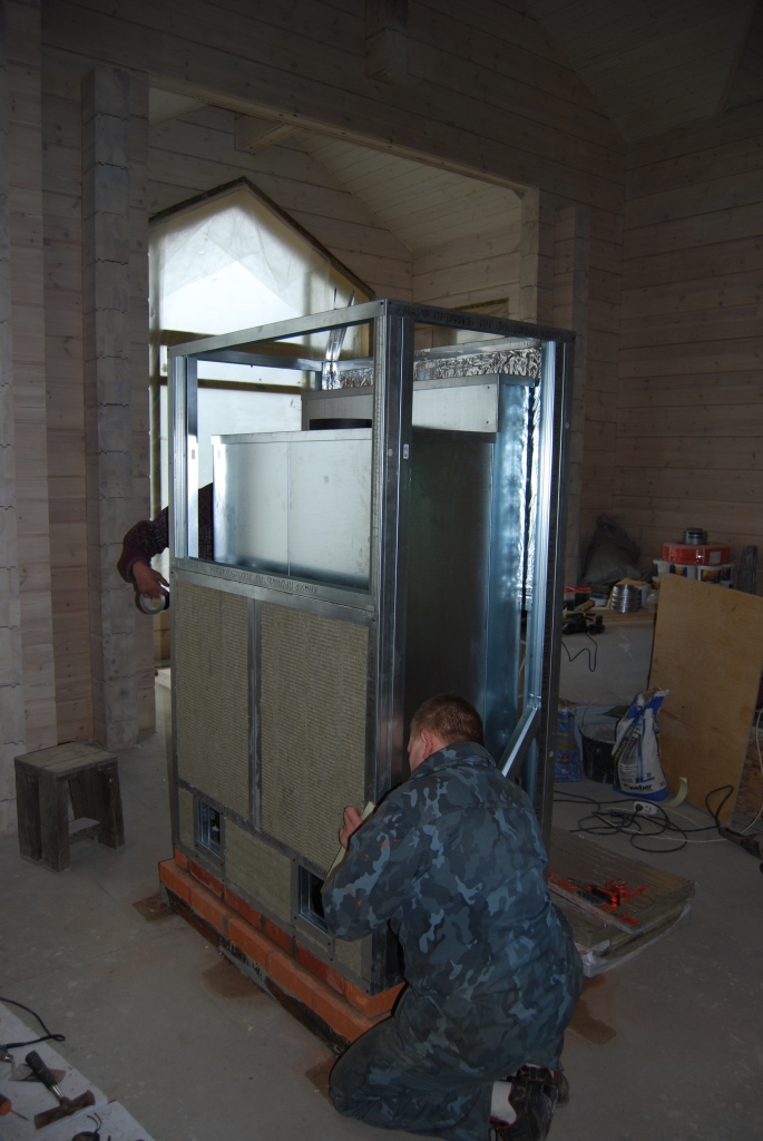 Монтаж... Все усугублялось ограниченностью пространства под камин. Лестничники оттяпали места сколько им надо... а выдвинуться в перед нам не позволяла стропильная система, или перешагивать через шаг стропилы... тогда вылезаем за границы подиума на 50 см... Архитектор закричал "АХТУНГ" низзя ни в коем случае. После ночного " мозгового штурма" и многочисленных согласований с заказчиком и архитектором а так же прорабом по общестроительным работам, было выработано решение, которое устроило всех!!!