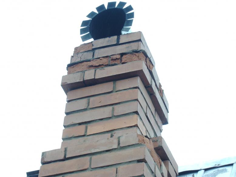 Давным давно, когда я делал трубы из кирпича, у меня то же самое было. Труба 2,5 м над кровлей, одет колпак, но боковым ветром дождь попадает на трубу, потом замерзает и рвёт кирпич.