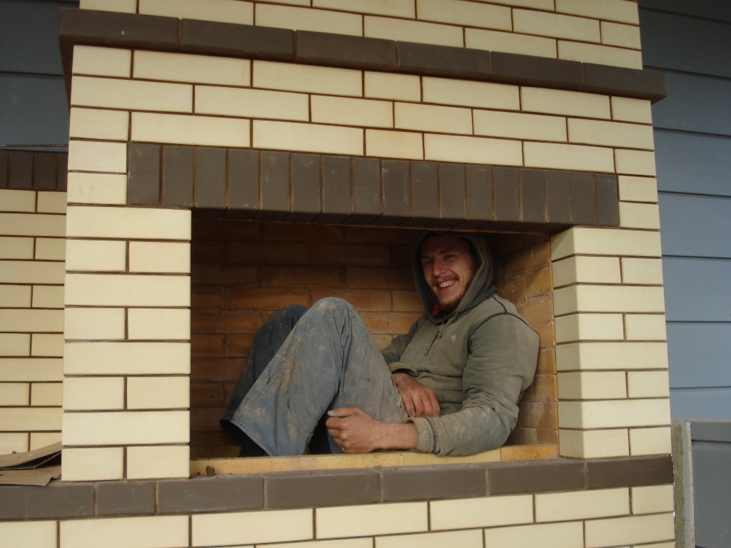 Саня ложи не бойся !!! Сам первый раз делал из Сармита год назад как только он появился на рынке главное тут 1) не вымачивай сильно в воде максимум опаласкивай 3-5 сек ( вода впитывается и оставляет серо-оранживые пятна ( см фото)) 2) раствор пожиже подрезай не пачкай кирпичь сразу затирай сухой тряпкой 3) осаживай киянкой которая не оставляет следов 4) у него размер 25.5 раскладывай не ленись особенно при стыковке Бруниса учитывай погрешность милиметров на тычках----------пока все а кирпич был финский с фигурной выемкой правда дырчатый но там нет температуры