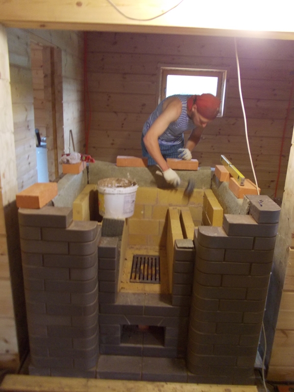 В комнате отдыха подняли стенки прошли полку и монтируем ручку от злх. В парной свели колпаки в одну трубу по этому печь получилась 32 ряда с перекрышкой ( ушли от боровка ) Загильзовали трубу прошли на 2 этаж