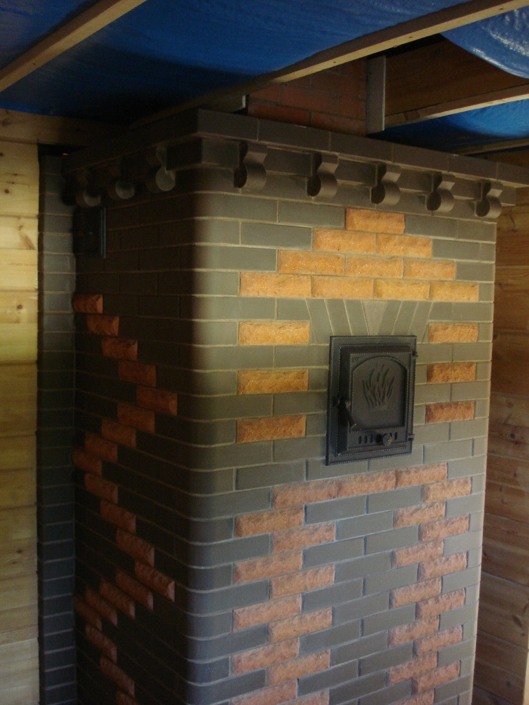 После пода под два ряда шириной 18 см были сделаны 4 таких газослива по два в каждый колпак ( фото нету ) выше напуск для опирание решетки на чем лежат камни.В камере под перекрышкой еще два выхода после заложены ( для фильтрующего режима) Камера перекрыта плитами ш-96 в середине была сделана злх из шамота с штокам.В парной сделана перемычка для дверки для пара . Фасад декорирован колотым кирпичем.